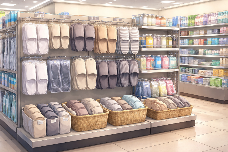 日用品コーナーに、使い捨てタイプや簡易スリッパが置かれていることが多いです。